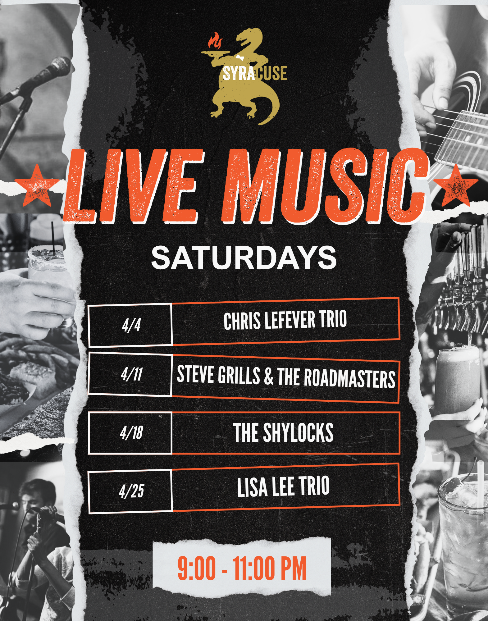 Syracuse Dinosaur Bar-B-Que 246 W Willow St, Syracuse, NY, United StatesLive Music at Dino Bar-B-Que Syracuse Join us at Dino BBQ Syracuse every Saturday night for LATE NIGHT AT THE DINO, for our LIVE MUSIC series featuring local bands playing…